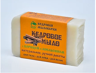 Мыло изготовлено вручную из природных ингредиентов. В его основе - кедровое масло с добавлением эфирных масел апельсина и корицы.